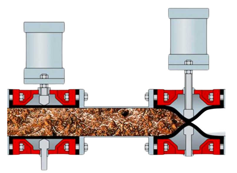 Vid stängning pressar två tryckstänger ihop slangen och stänger den vid mittlinjen.